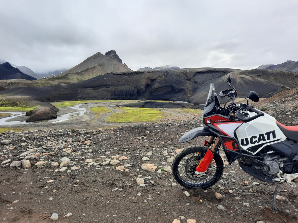Schon die folgenden Kilometer waren einfach genial. Es war Ende Juli, hatte zwischen zehn und 13 Grad Celsius, was in den dünnen Endurohandschuhen zwischendurch auch unangenehm war, vor allem, weil die meisten der Ducati DesertX keine Heizgriffe hatten und die Pausen, um seine Patschen am Motor zu wärmen, ziemlich kurz waren. Apropos: Die DesertX war ein weiterer Grund, weshalb ich ein wenig nervös war. Ich war sie zwar schon gefahren, aber nur auf der Straße. Ich wusste, dass das Motorrad im Gelände sehr viel kann. Ich wusste aber nicht, ob ich mit der angeblich sportlichen Charakteristik klarkommen würde. All diese Sorgen sollten sich zum Glück schnell als unbegründet herausstellen… Schon jetzt wechselte die Landschaft ständig ihr Gesicht. Kaum hatte man ein paar Eindrücke registriert (von verarbeiten kann keine Rede sein), änderte sich schon wieder alles. Sind wir hier auf dem Mond? Ich wusste schon jetzt, dass ich das Wörterbuch wohl lange wälzen müssen würde, um halbwegs passende Adjektive zu finden.