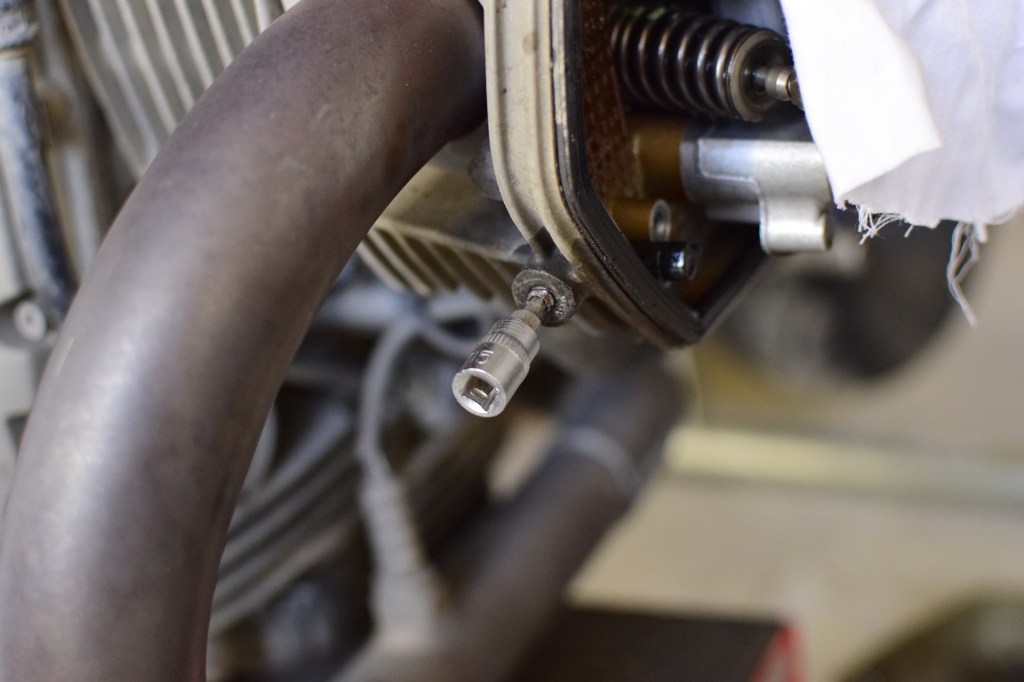 Es passierte genau so, wie solche Sachen wohl meistens passieren: Bei einer Routinearbeit. Und Ventilspiel am K25-Vierventilboxer checken ist mittlerweile Routine. Genauso wie das, was als Vor- und Nacharbeit fällig ist. Also Zylinderkopfhaube abschrauben, Zündkerzenstecker und Zündkerzen entfernen, „richtigen OT“ finden. Die Arbeit war also getan, inklusive Axialspiel prüfen. Sicherheitshalber danach nochmal das Schrauberhandbuch konsultiert. Weil die vier Schrauben ja immer verdächtig wenig Drehmoment hatten. 20. Ahja. Dass ich hin und wieder belächelt werde, weil ich für so gut wie alles einen Drehmomentschlüssel benutze, sollte sich an diesem Tag endlich rächen. Ich wunderte mich zwar noch, warum der Proxxon nicht auslösen wollte, aber ich drehte munter kreuzweise weiter. Bis es irgendwann knackte – allerdings nicht im Drehmomentschlüssel, sondern irgendwo anders. Oha. Der Casus Knaxus. Die durchdrehende Schraube bestätigte meine Befürchtungen – Schraube abgerissen.