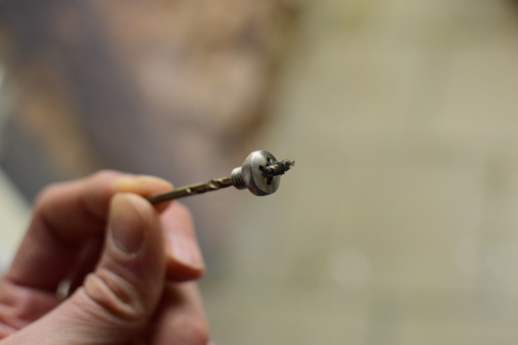Ein paar Momente später blitze ein Stück der Schraube raus. Ich wollte mich noch nicht freuen, aber es schien tatsächlich zu funktionieren. Die ganzen Horrorgeschichten abgebrochener Ausdreher, die dann ein noch viel größeres Problem ergaben (gerade bei kleinen Schrauben) hatten mich schon zweifeln lassen. Aber mit jeder Umdrehung wuchs die Vorfreude.