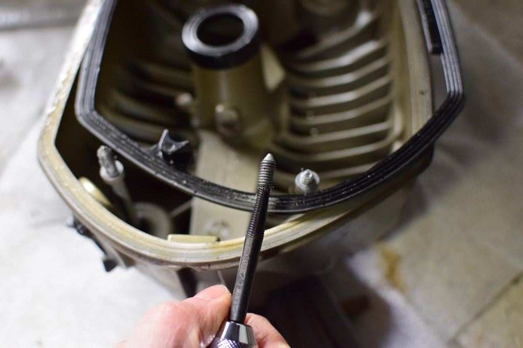 In der Zwischenzeit hatte ich die Theorie entwickelt, dass ich hier und bei der anderen Schraube einfach viel zu wenig gebohrt hatte. Und der Linksausdreher kein Fleisch hatte, in das er sich verbeißen könnte. Also bohrte ich noch ein wenig weiter. Sssssssssssssssssssssssssssssst. Dann setzte ich den 2er-Ausdreher in den Werkzeughalter – den konnte ich wenigstens drehen, ohne an den Ventiltrieb zu stoßen. Und das fühlte sich gar nicht so schlecht an…