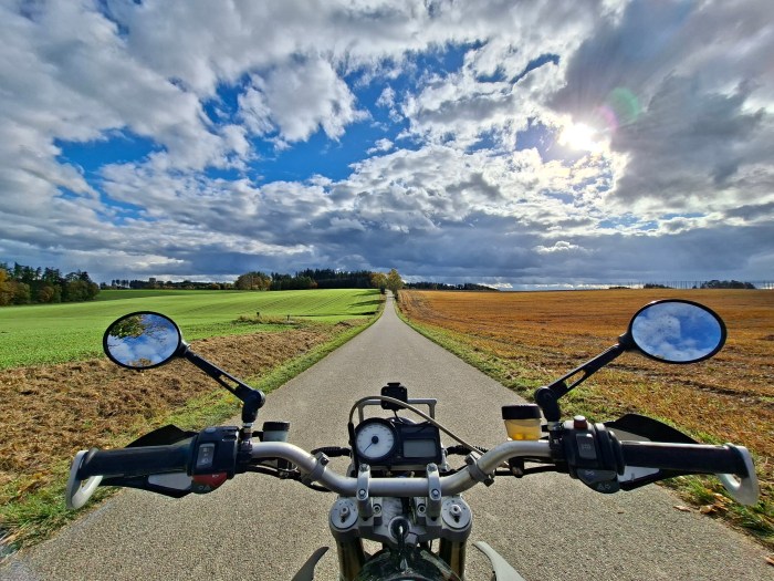 Auch wenn das Bild von einer der letzten Fahrten im Herbst stammt – die winterliche Durststrecke nähert sich dem Ende. Bald zweistellige Temperaturen und sonnige Tage ziehen mich langsam wieder Richtung Sitzbank. Ich habe auch guten Grund dazu: Ich bin ausnahmsweise zu Fahrpräsentationen in südlicheren Gefilden eingeladen, und bis dahin möchte ich unbedingt schon mal auf dem Motorrad gesessen sein. Im besten Fall erledige ich das unsichere Rumeiern auf den ersten Metern nämlich hier, auf einsamen Landstraßen und Feldwegen. Und nicht umgeben von Pressekollegen und Fotografen. Daher habe ich mir ein kleines Warm-Up-Programm auferlegt, um wieder „bike-fit“ zu werden. Via Google Maps habe ich auch schon ein, zwei „Trainingsplätze“ ausgekundschaftet.